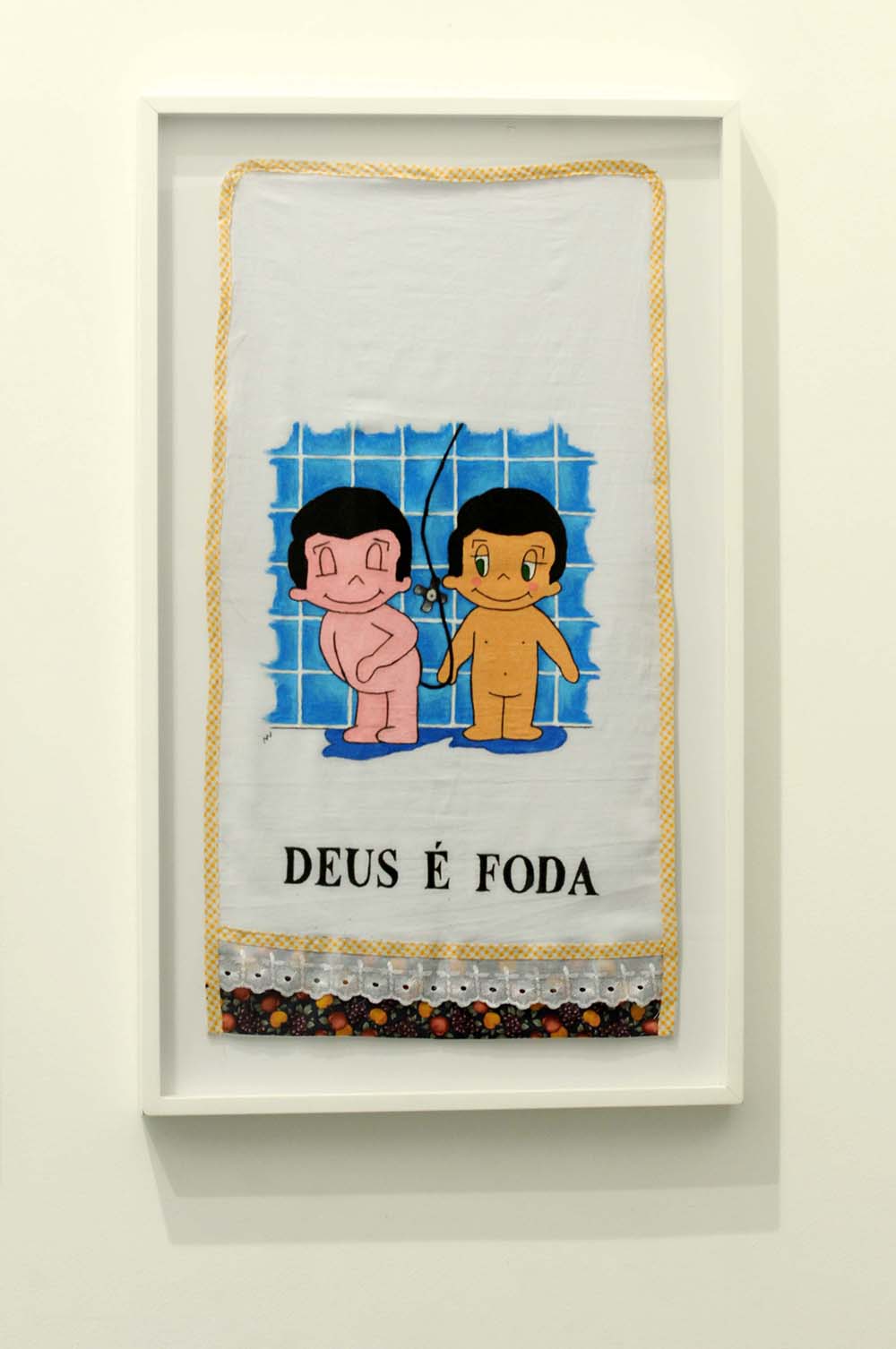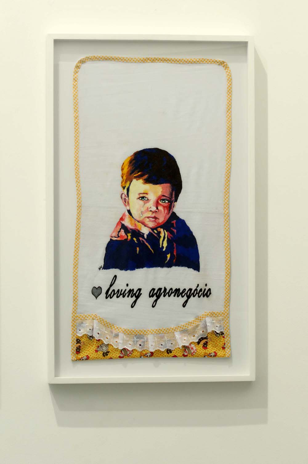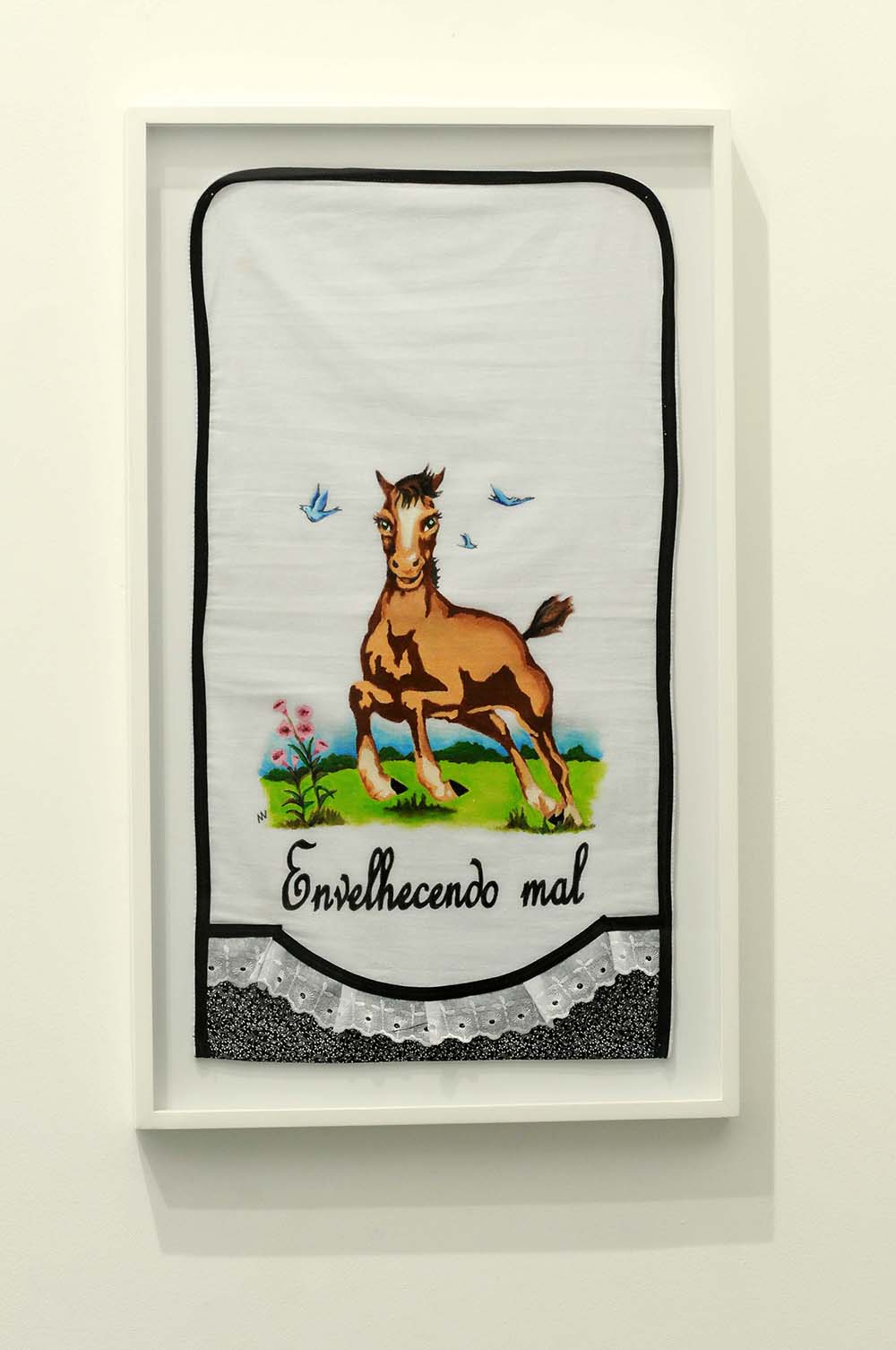 Segue aí alguns trabalhos da série Cenas para uma Vida Melhor, que desenvolvo há anos, com a técnica do bordado, onde mesclo, com ironia “gauche”, sensacionalismo, beleza e mau gosto, comentando nossa incapacidade de convívio com a própria sede de poder, nossa intolerância ao diferente ou nossas grandes e pequenas violências cotidianas. Isso também aparece na outra série, “Meritocracia do Pano de Prato”, que dá conta de misérias e baixezas cotidianas, tratadas docemente com imagens de cavalinhos, ursinhos, flores e todo um mundo de delícias que as donas de casa, as artesãs bem dedicadas aplicam a panos de prato. Sempre atrelada à alegria – que é a prova dos nove, mais uma vez afirmo meu abuso do mau gosto como território onde, a despeito dos coxinhas ou dos bolivarianos, todos nos irmanamos, no demasiado humano desejo de sermos amados.