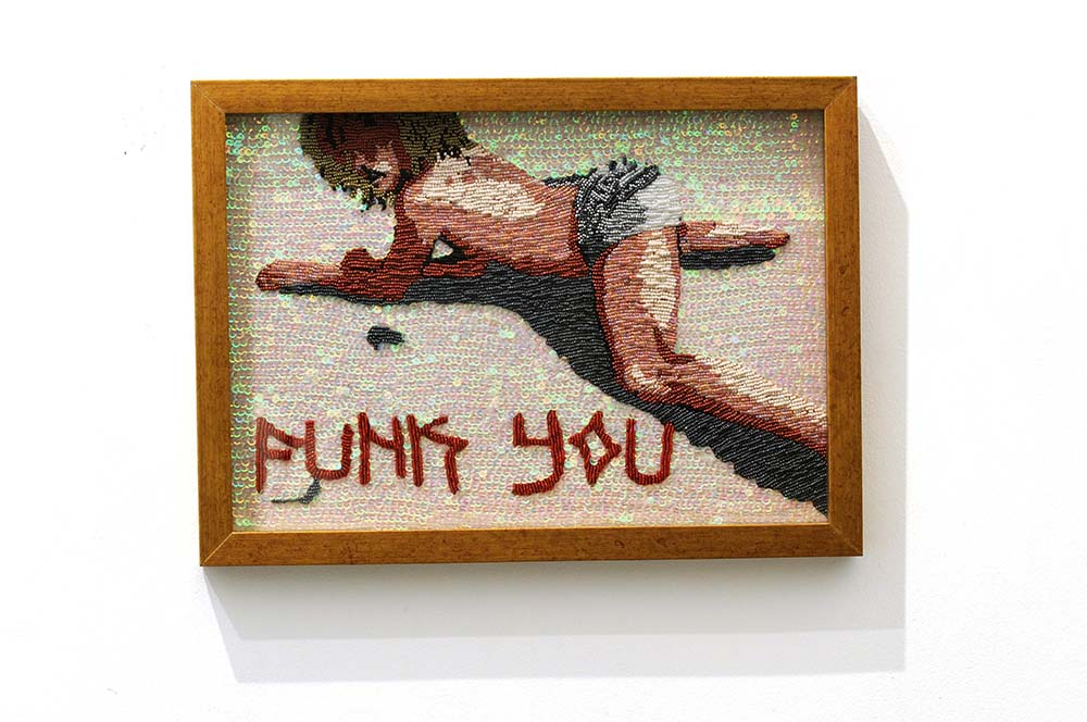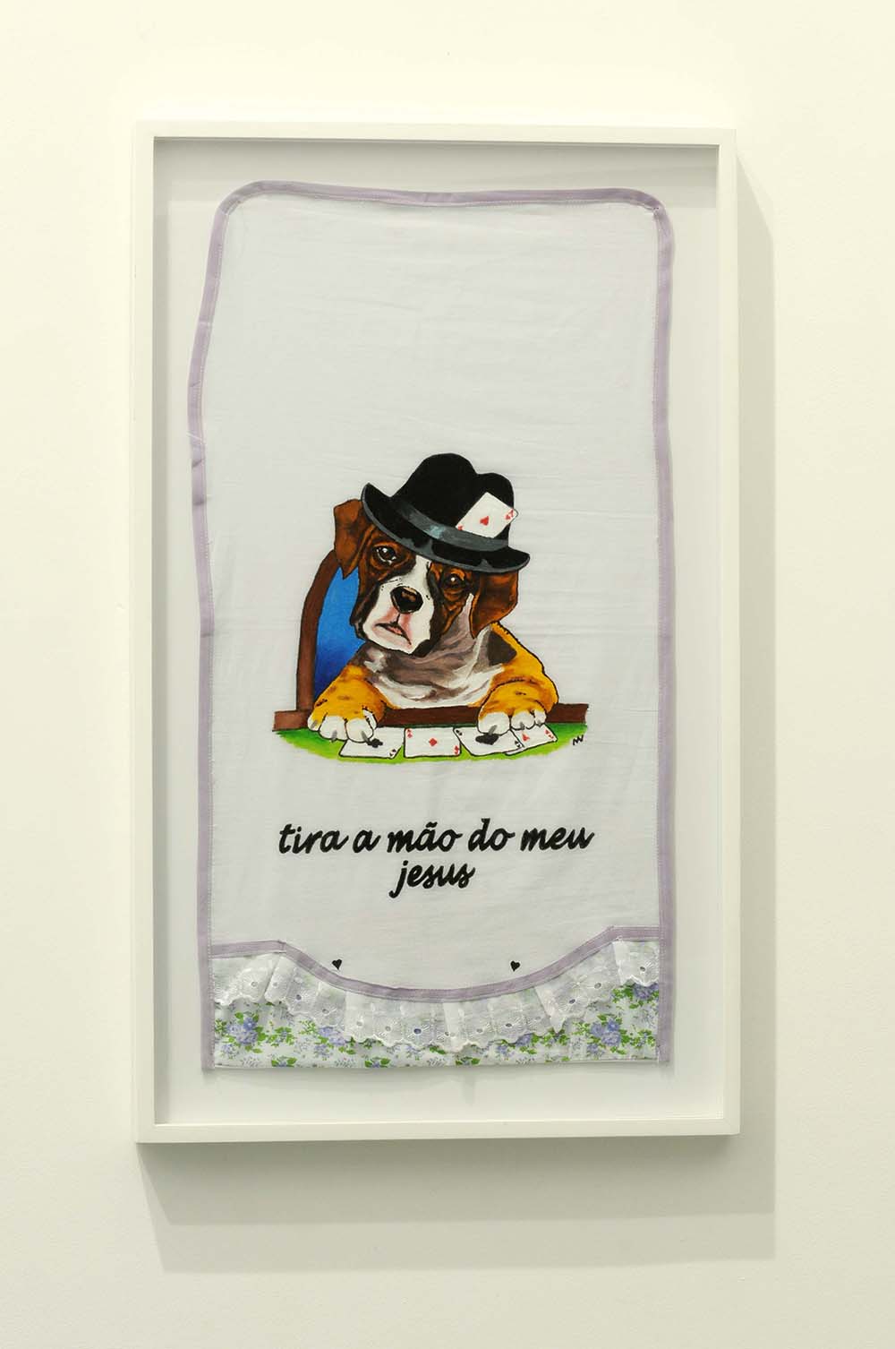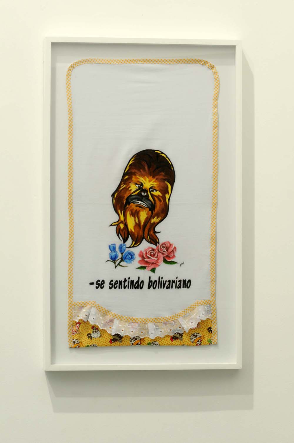 Segue aí alguns trabalhos da série Cenas para uma Vida Melhor, que desenvolvo há anos, com a técnica do bordado, onde mesclo, com ironia “gauche”, sensacionalismo, beleza e mau gosto, comentando nossa incapacidade de convívio com a própria sede de poder, nossa intolerância ao diferente ou nossas grandes e pequenas violências cotidianas. Isso também aparece na outra série, “Meritocracia do Pano de Prato”, que dá conta de misérias e baixezas cotidianas, tratadas docemente com imagens de cavalinhos, ursinhos, flores e todo um mundo de delícias que as donas de casa, as artesãs bem dedicadas aplicam a panos de prato. Sempre atrelada à alegria – que é a prova dos nove, mais uma vez afirmo meu abuso do mau gosto como território onde, a despeito dos coxinhas ou dos bolivarianos, todos nos irmanamos, no demasiado humano desejo de sermos amados.