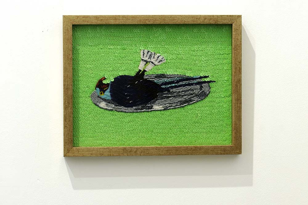 Para esta exposição, Marta selecionou obras das séries Cenas para uma vida melhor, em que apresenta bordados com missangas e lantejoulas, e Meritocracia do Pano de Prato, panos de prato pintados à mão e emoldurados.