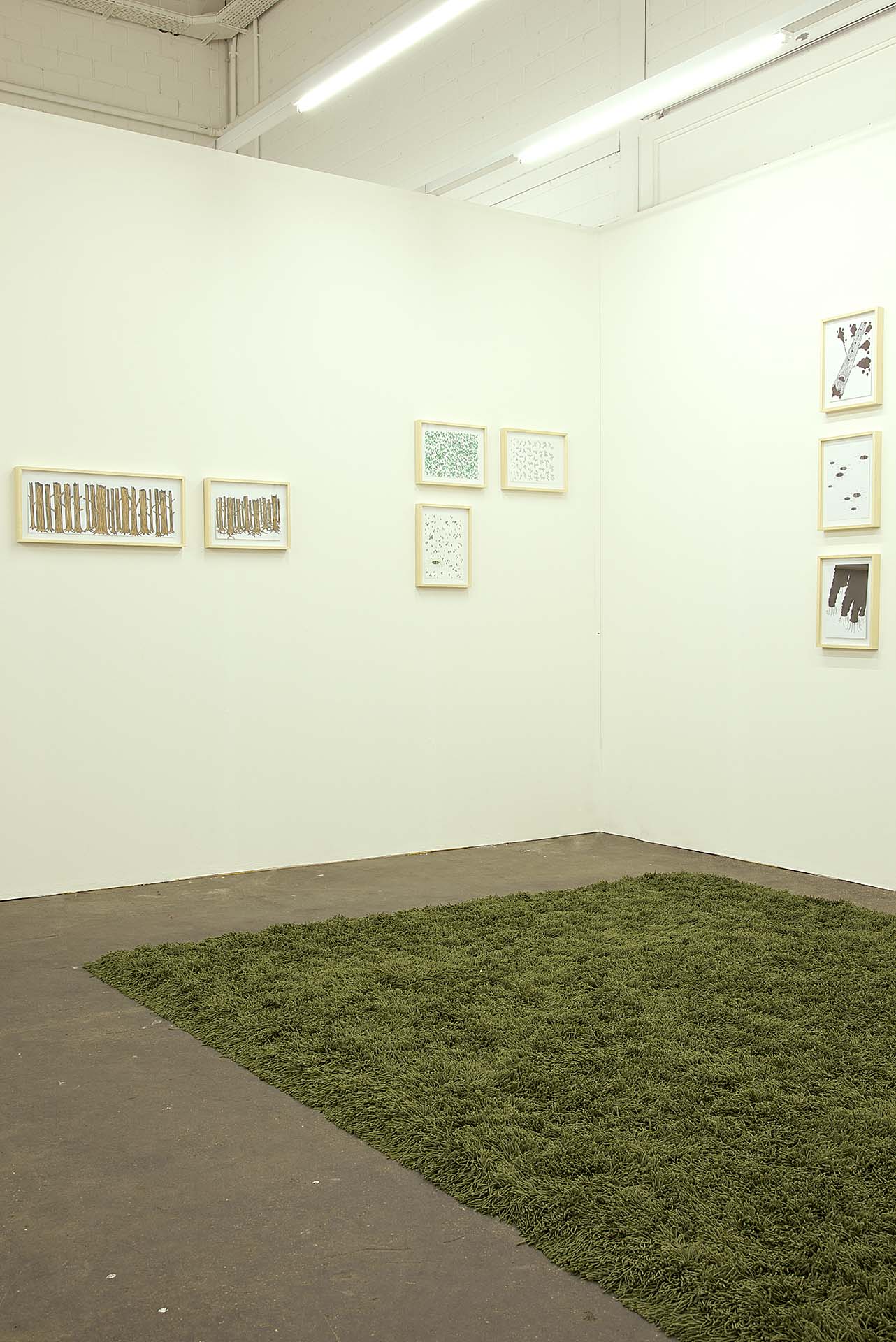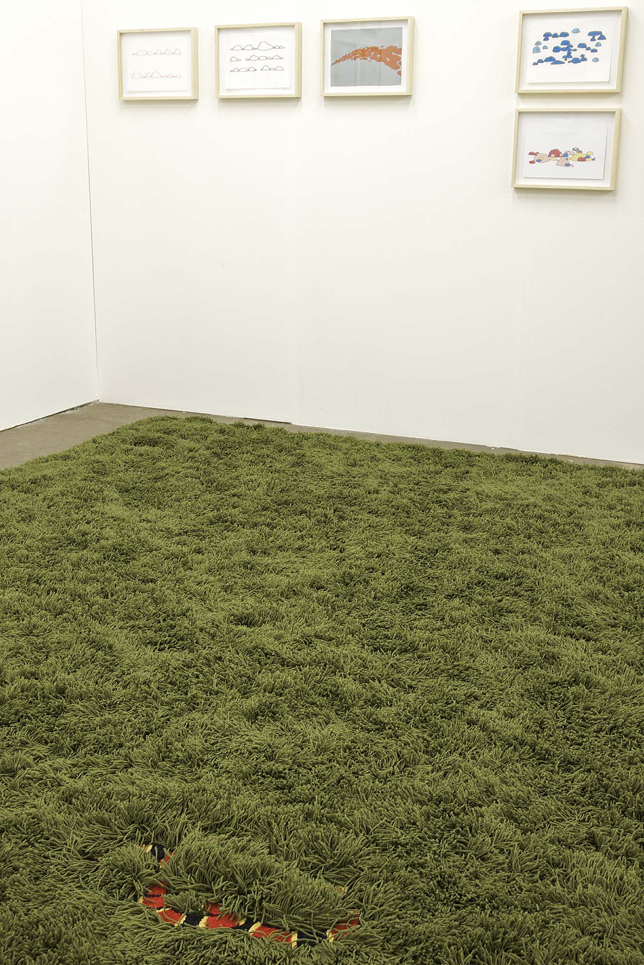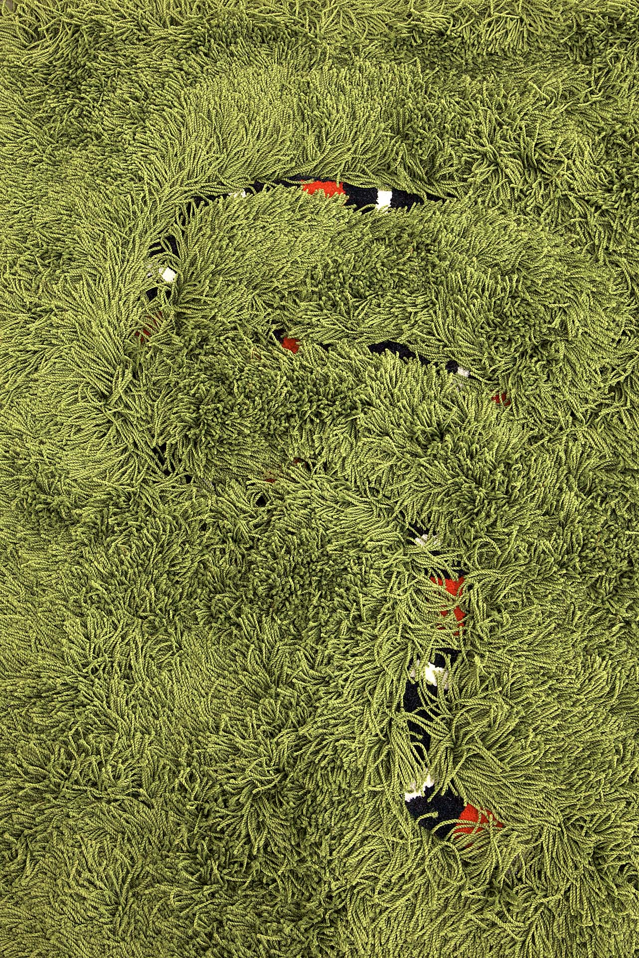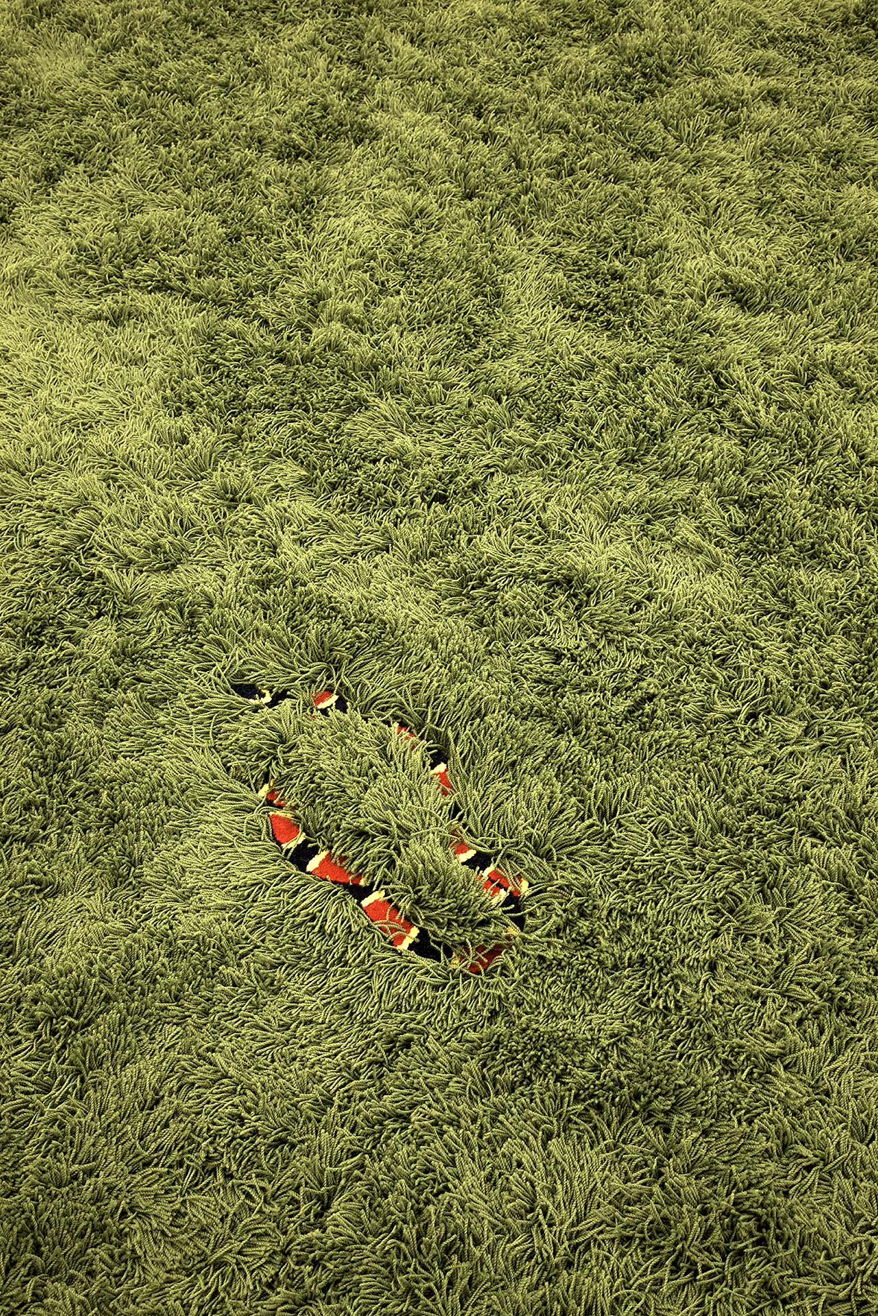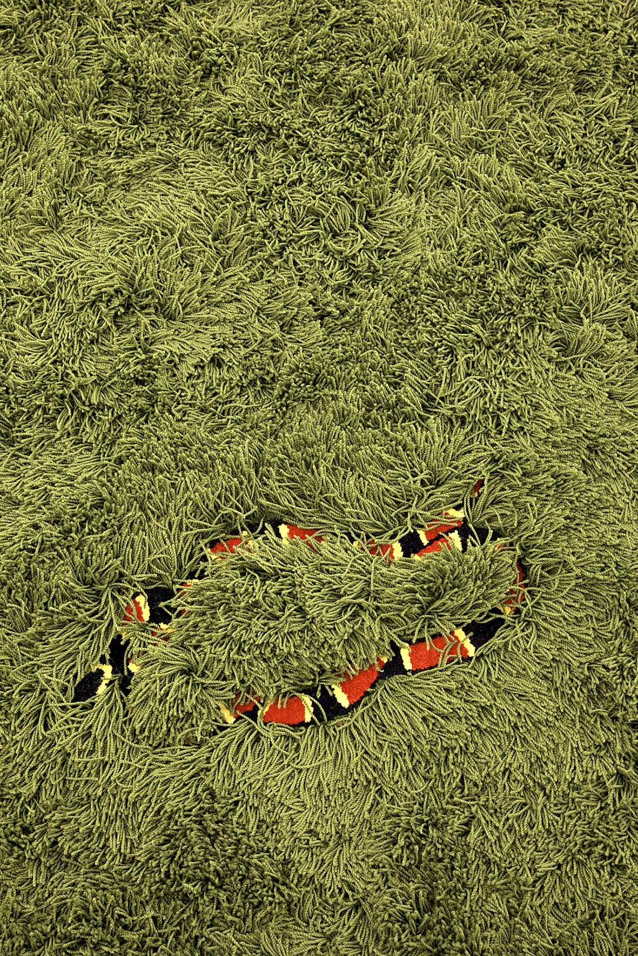 O trabalho intitulado Tapete de Cobras é um tapete retangular, medindo 350 x 250 centímetros, feito do mesmo material que os tapetes domésticos comuns. Ele é todo verde-folha, em fios de nylon de sete centímetros de comprimento que se emaranham aludindo a um gramado relvado. No entanto, entre seus fios compridos existem áreas com fios curtos, de um centímetro apenas, formando representações de três cobras venenosas em tamanho natural. São três espécies distintas de cobras Coral: Allen’s Coralsnake, Southamerican Coralsnake e Western Coralsnake. Elas estão distribuídas pelo tapete de modo que, ao circular sobre o trabalho, as pessoas possam descobrir cobras escondidas entre seus pelos, operando um deslocamento da instância doméstica para uma que se refere a uma situação de risco. É um trabalho que sugere um perigo iminente, a proximidade de um acidente, confundindo tais situações à morosidade do ambiente doméstico, do item de decoração da casa, da funcionalidade de um objeto reconhecível.